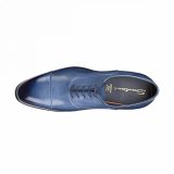 Chaussure à lacets en cuir vieilli à la main. Un richelieu à 5 œillets sophistiqué se distinguant par ses lignes fuselées, arborant d’intenses nuances chromatiques de bleu. Montage Goodyear. Semelle en cuir. Chaussures confectionnées de façon artisanale.