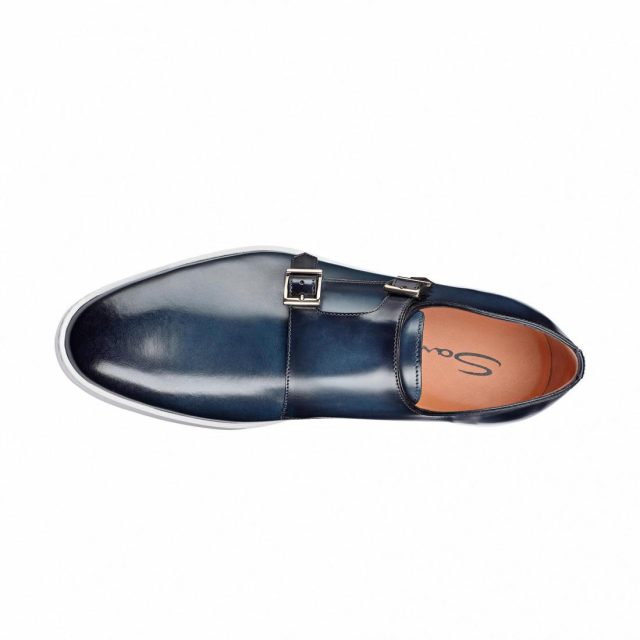 Double boucle en cuir lisse bleu. Un modèle qui allie la fonctionnalité à l’élégance et se distingue par son rabat doté de deux boucles. Bout fuselé. Semelle en caoutchouc, déclinée en couleur blanche contrastante. Made in Italy.