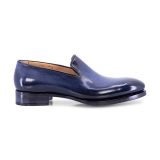 Mocassin en cuir vieilli et poli à la main bleu. Un modèle aux lignes épurées, qui se distingue par sa coloration en dégradé. La tige lisse est confectionnée à partir d’un unique morceau de cuir, mis en valeur par son aspect poli réalisé à la main. Le mon
