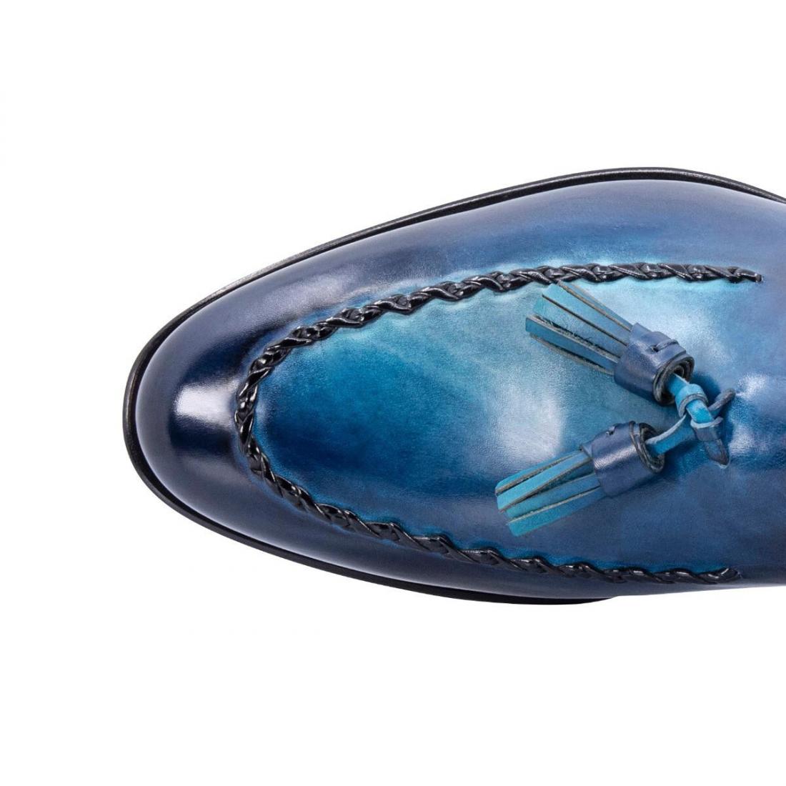Mocassins en cuir bleu Sirolo. Une chaussure caractérisée par d’intenses nuances colorées et des finitions tressées. Un modèle rehaussé de deux glands sur le devant. Tige ornée d’une couture tubulaire. Silhouette fuselée, semelle en cuir. Made in Italy.