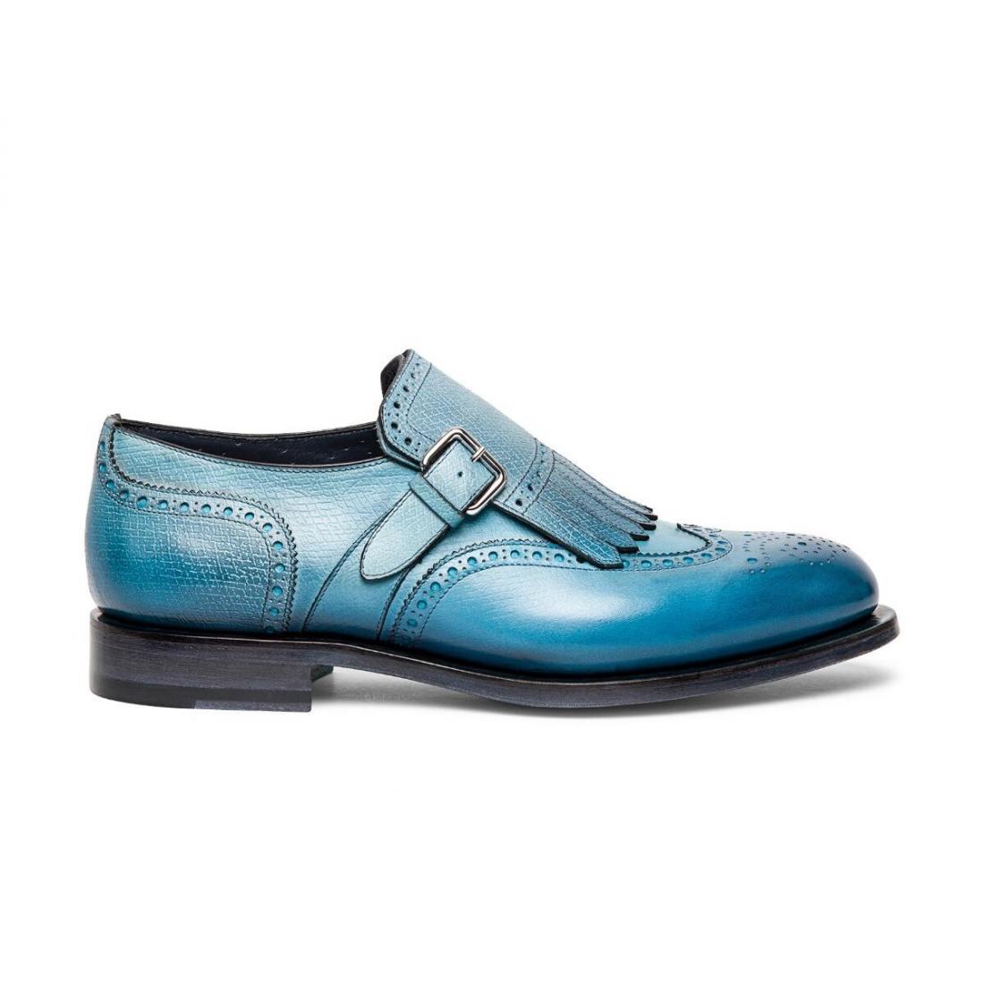 Mocassins à boucle en cuir bleu Guado vieilli à la main. Un élégant modèle brogue rehaussé d’une boucle latérale et de grandes franges mises en valeur par des nuances de couleurs désaturées exécutées à la main. Perforations décoratives fleuries sur la tig