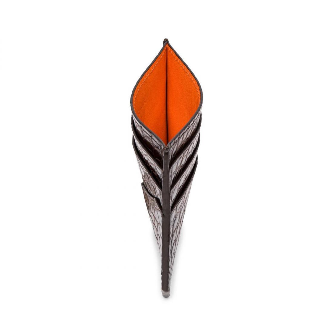 Extrêmement fonctionnel, ce porte-cartes est confectionné en cuir de crocodile marron foncé. Le modèle présente des coins plats. Made in Italy.