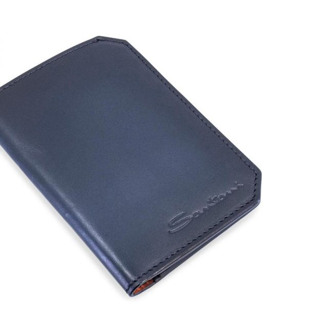 Porte-cartes vertical en cuir bleu vieilli à la main, tout comme les nuances de la matière. Angles arrondis. Modèle personnalisé avec le logo Santoni estampé sur le devant. Made in Italy…