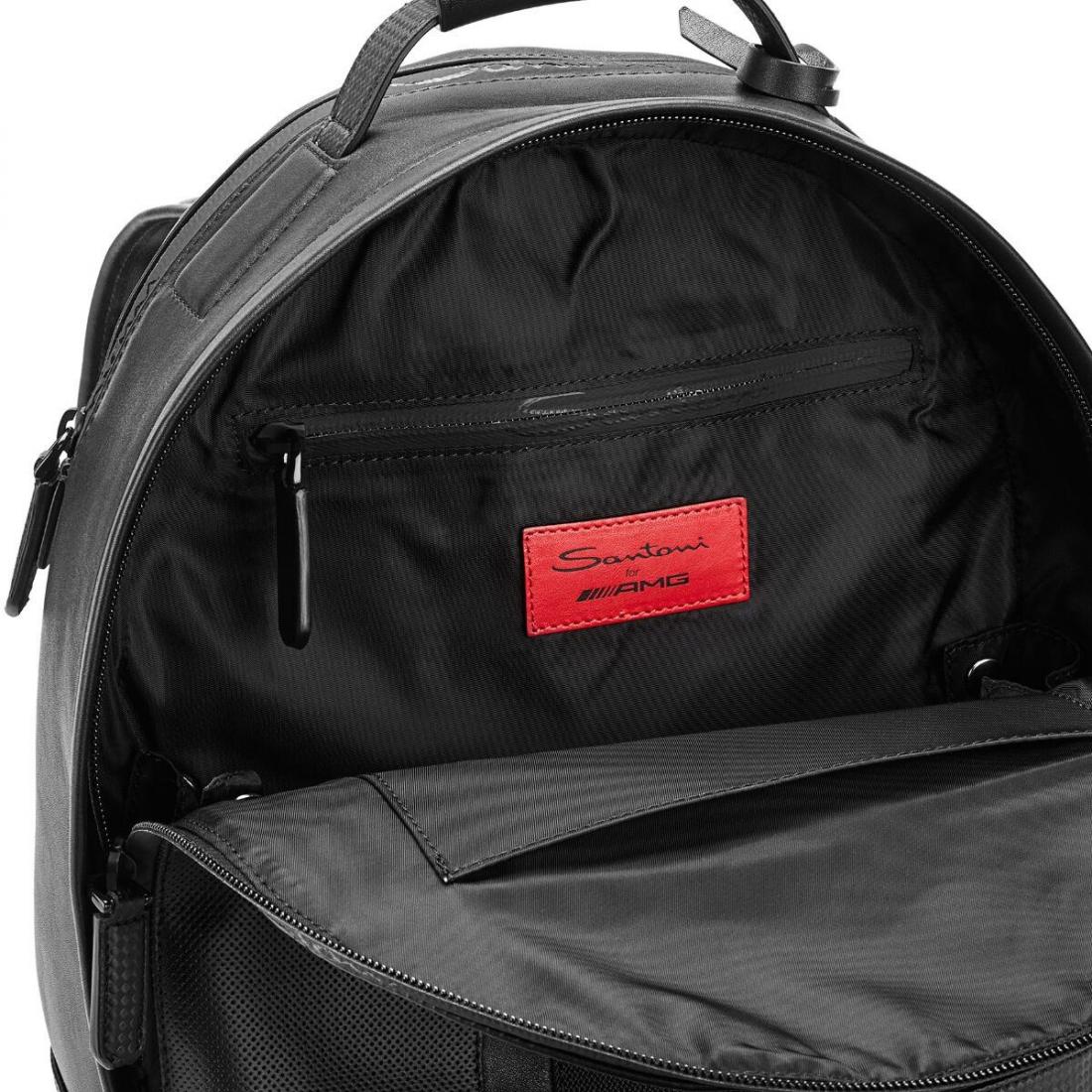Sac à dos pour femmes en cuir lisse noir. Le devant se distingue par un insert en tissu technique et une grande poche dotée d’une tirette en cuir. Poignée en cuir, bretelles réglables. Modèle de la ligne Santoni pour AMG.