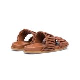 Sandales en cuir marron Urbino. Une claquette au caractère audacieux, caractérisée par deux lanières souples effet drapé. Semelle en caoutchouc. Hauteur : 5 cm. Made in Italy.