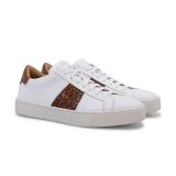 Sneakers en cuir blanc pur. Un modèle bas à lacets caractérisé par une bande latérale en cuir tressé et un empiècement en cuir marron Osimo sur le talon. Semelle en caoutchouc. Made in Italy.
