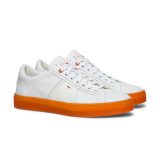 Sneakers en cuir blanc pur. Un modèle bas à lacets affichant une silhouette essentielle et des surpiqûres décoratives sur la tige. Semelle orange en caoutchouc. Made in Italy.