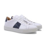 Sneakers en cuir blanc pur. Un modèle bas à lacets caractérisé par une bande latérale en cuir tressé et un empiècement en cuir bleu adriatique sur le talon. Semelle en caoutchouc. Made in Italy….