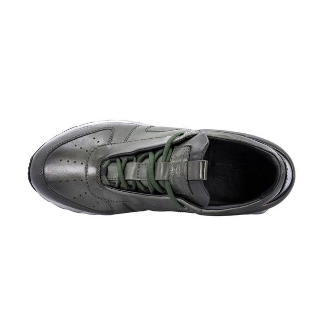 Baskets en cuir vieilli vert olive. Un modèle à lacets au caractère artisanal. La tige présente un dessin de surpiqûres et des perforations décoratives. Semelle en caoutchouc modèle running avec logo AMG appliqué. Made in Italy.